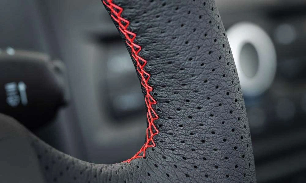 | Отделка руля, чехла КПП кожей с красной отстрочкой |
