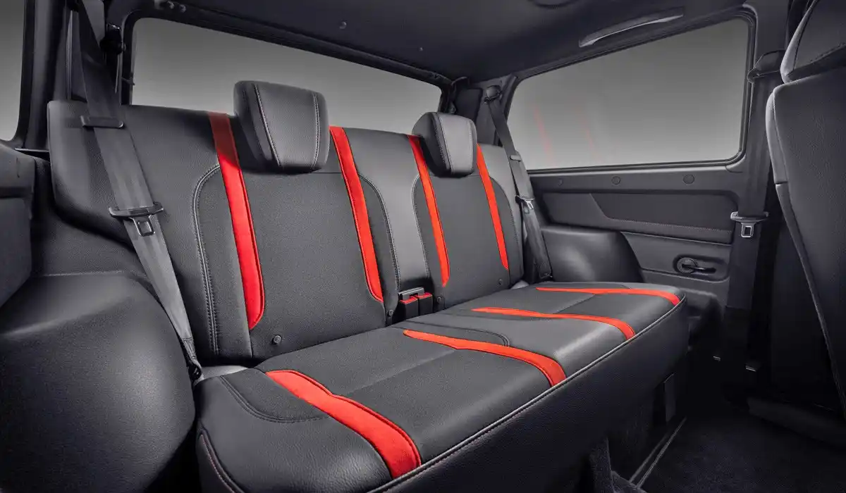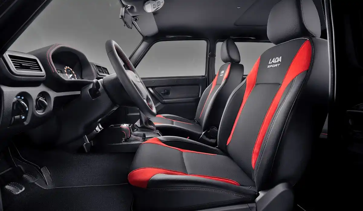 | Обивка сидений комбинированная: ткань/искожа с отстрочкой и логотипом [LADA SPORT] на передних сиденьях. Цвет черный с красными вставками (нубук) |