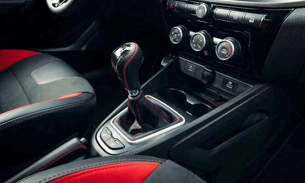 | Отделка руля, чехла КПП кожей с красной отстрочкой |